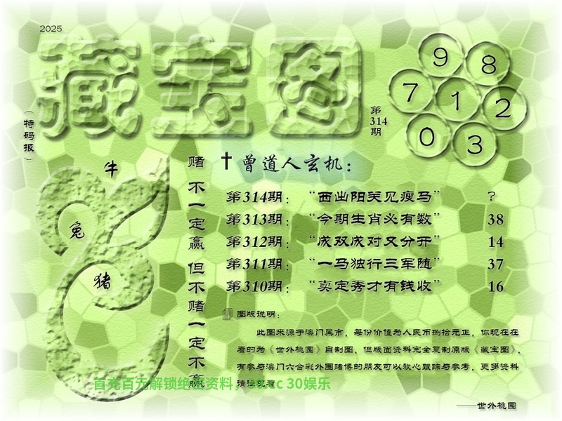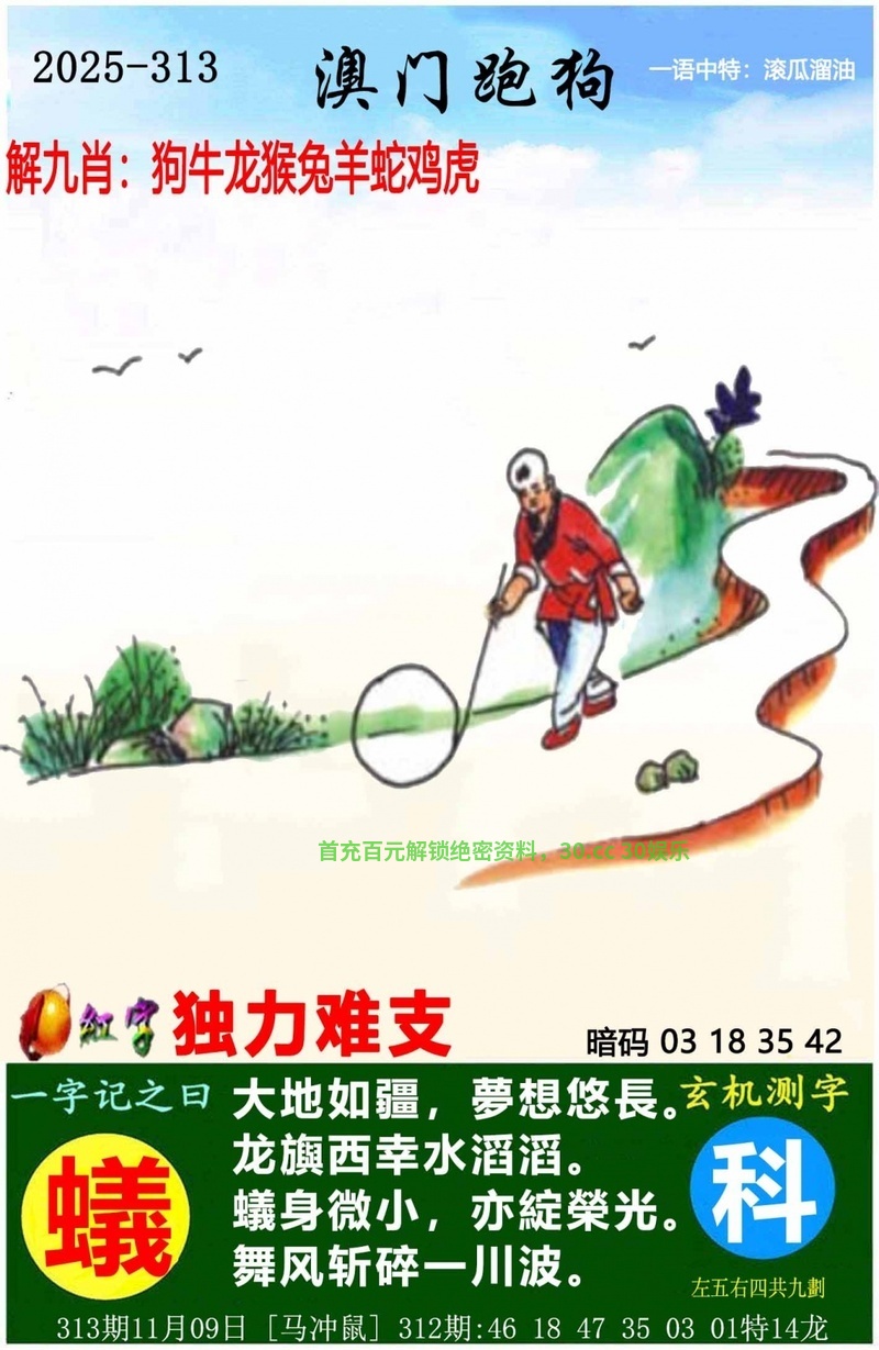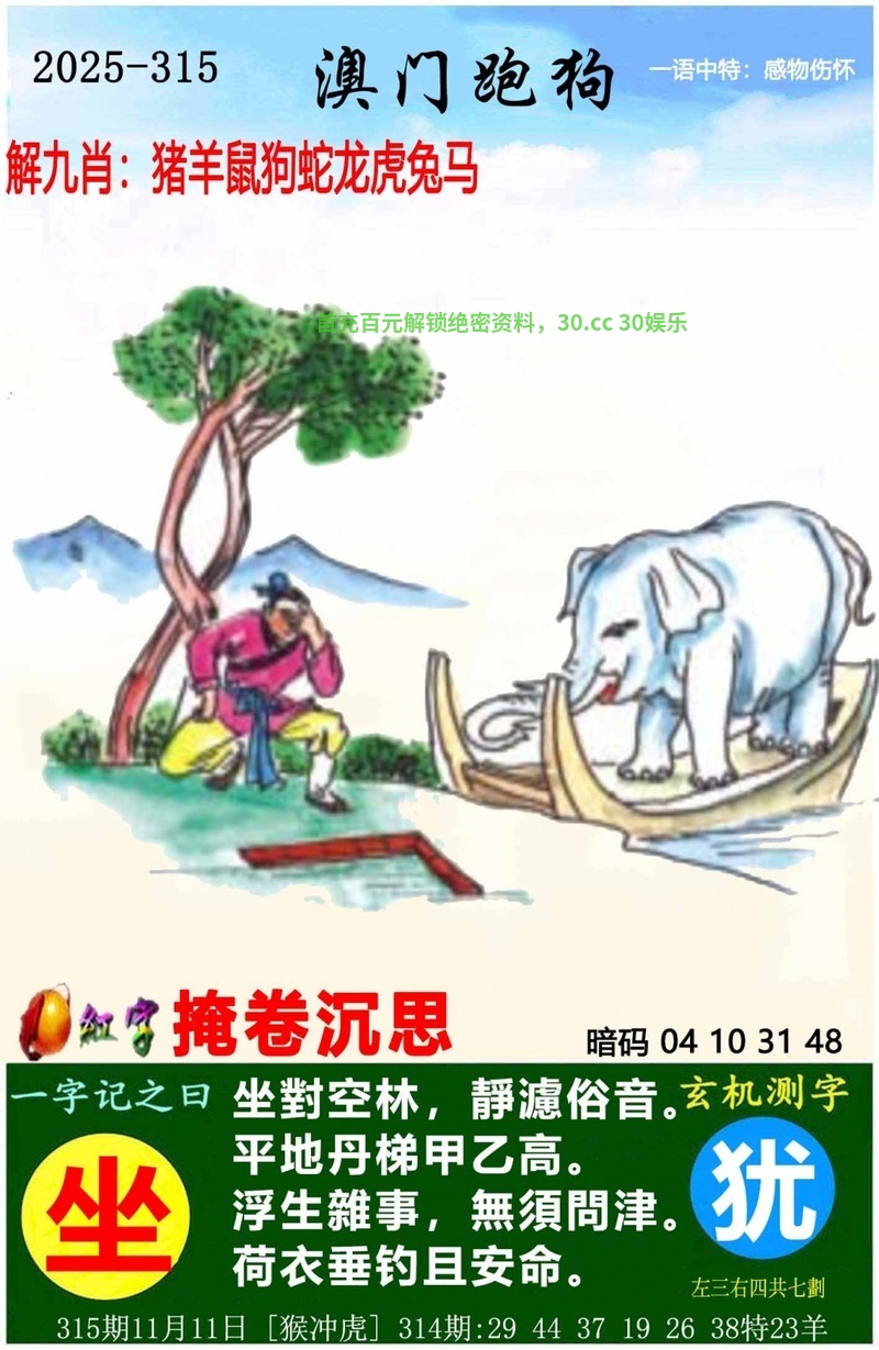 | 314期:西出阳关见瘦马 解释:西出阳关见瘦马,阳关,解阳肖牛虎兔羊猴鸡 藏宝九肖:牛虎兔羊猴鸡马蛇狗 藏宝⑩码:05.17.28.03.23.22.21.12.01.44 |