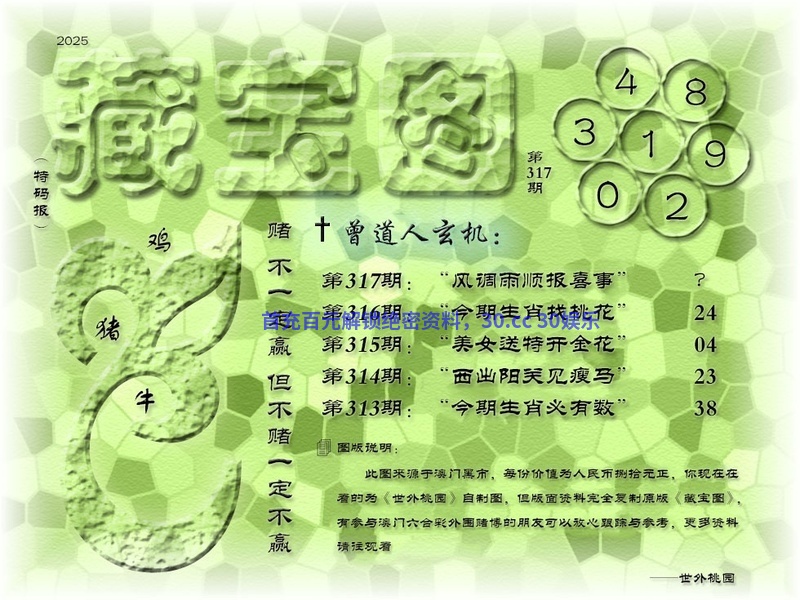 | 318期:三上三下有玄机 解释:三上三下有玄机,三上,04虎,三下02龙,三,解单肖牛鸡猪羊兔蛇 藏宝九肖:虎龙牛鸡猪羊兔蛇鼠 藏宝⑩码:04.40.02.05.21.31.23.03.13.30 |